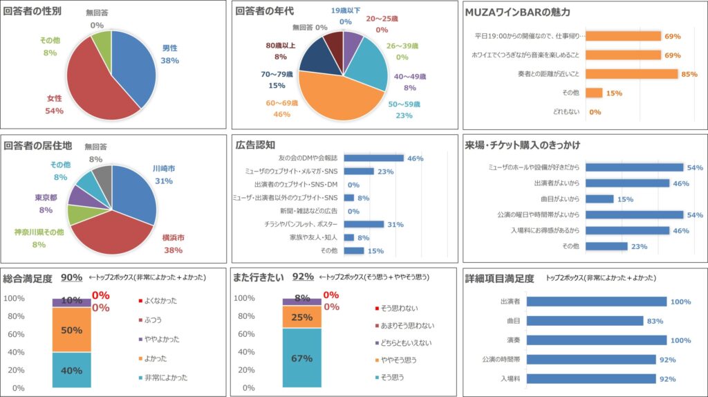 | 103103 | とてもよかった | ワインBAR、あたかもライブハウスにいるようでとてもリラックスして楽しめました! 今回はかわジャズの一環と思いますが、今後は是非、四季折々に開催して欲しいです。(満員とのことなのでスタンディングを販売しても良いのでは?) (横浜市中区、50~59歳男性) |